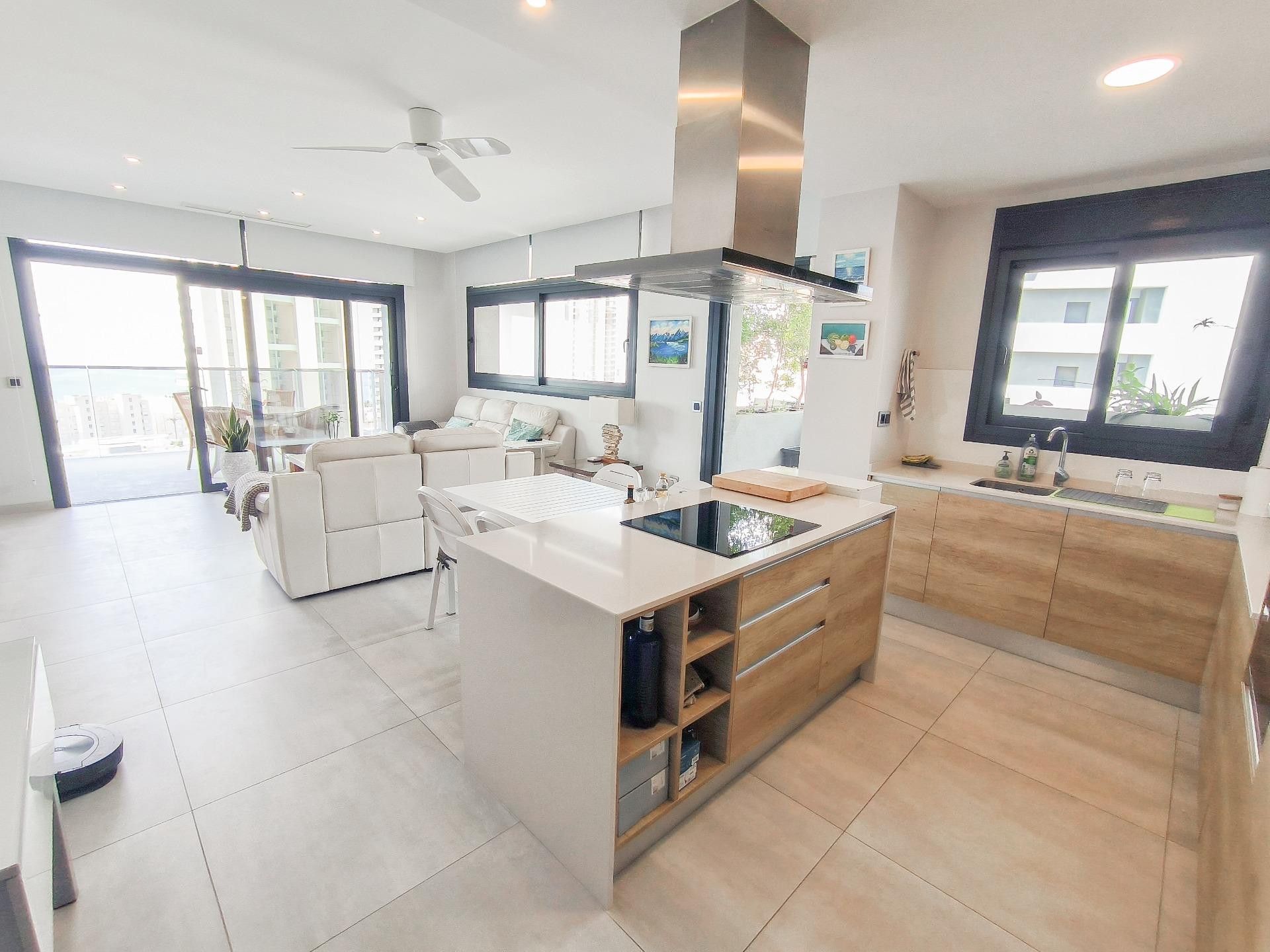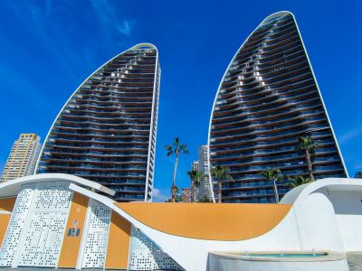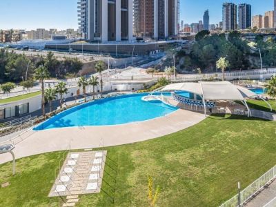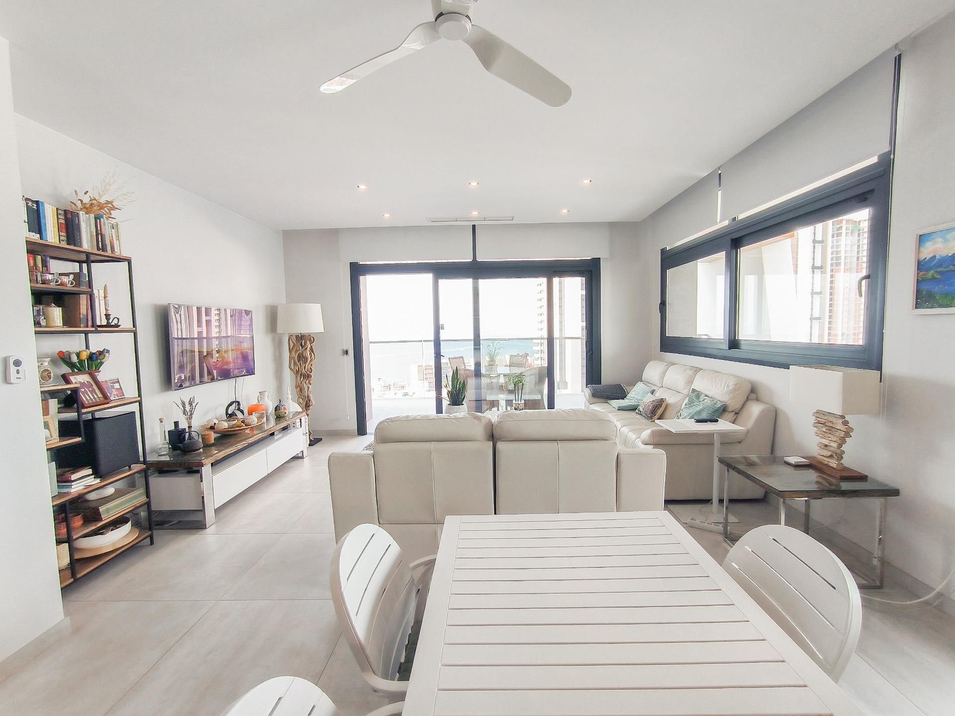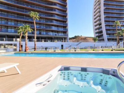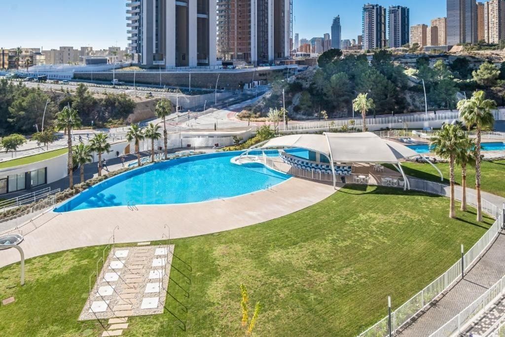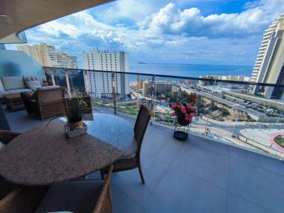 Современные апартаменты с потрясающим видом на Средиземное море и горы в курортном городе Бенидорм.